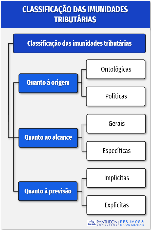 As imunidades tributárias previstas na Constituição Federal são classificadas quanto à sua previsão, origem e alcance. Em termos de prova da OAB não houve cobrança explícita quanto a esta classificação. Entretanto, consideramos importante trazer estes conceitos pois o entendimento deles é necessário para os estudos das imunidades recíproca, religiosa, cultural e de partidos políticos que vamos estudar mais à frente.