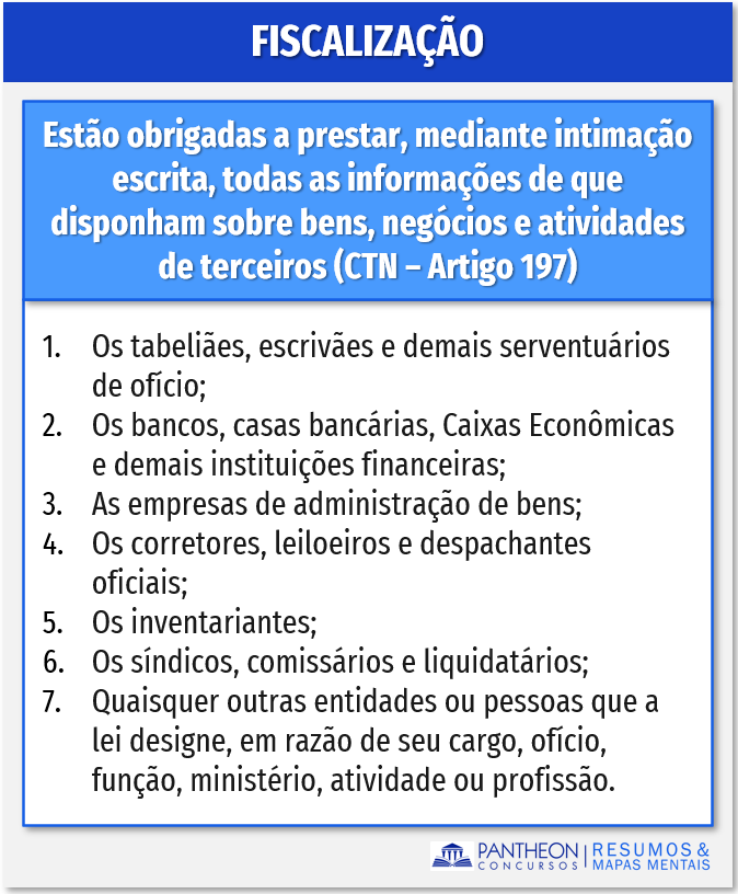 Seguindo com nosso estudo, trago a vocês o teor do artigo 197 do CTN que trata das pessoas que estão obrigadas a prestar, mediante intimação escrita, todas as informações de que disponham sobre bens, negócios e atividades de terceiros: