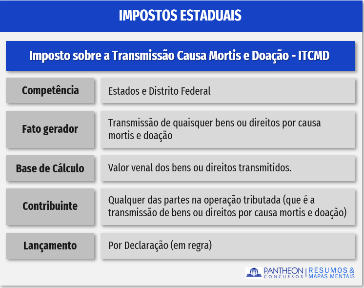 Este imposto, de competências dos Estados e do Distrito Federal, possui natureza fiscal (arrecadatória) e incide sobre a transmissão causa mortis e doação, de quaisquer bens ou direitos (ITCMD). Sobre esta incidência, quando esta ocorrer sobre bens imóveis e respectivos direitos, a competência será do Estado onde se encontrar o imóvel.