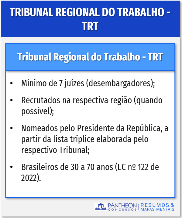Conforme o art. 115 da CF/88, os Tribunais Regionais do Trabalho são juízos colegiados, sendo compostos de, no mínimo, 7 juízes, recrutados, quando possível, na respectiva região, e nomeados pelo Presidente da República dentre brasileiros com mais de 30 e menos de 70 anos (conforme alteração da Emenda Constitucional n. 112, de 2022). Sistematizando: