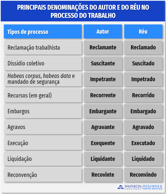 Para facilitar vamos montar uma tabela com as principais denominações do autor e do réu no processo do trabalho a depender do instrumento: