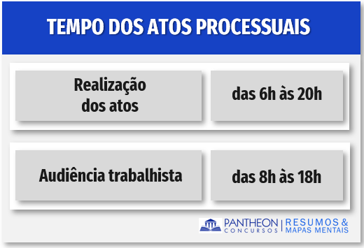 Finalmente, os atos realizar-se-ão nos dias úteis das 6 às 20 horas. Atenção que esse horário é distinto ao horário da realização das audiências trabalhistas, que ocorrem entre 8 e 18 horas, não podendo ultrapassar 5 horas seguidas, salvo quando houver matéria urgente (art. 813, da CLT).