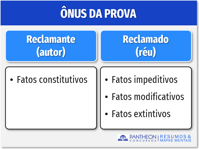 Para facilitar, incumbe ao autor da reclamação provar os fatos constitutivos de seu direito, por exemplo, o não recebimento de férias, equiparação salarial, não pagamento de horas extras etc. Por seu turno, ao réu, caberá provar os fatos que impedem, modificam ou extinguem aqueles fatos alegados pelo autor. Vamos montar um quadrinho comparativo: