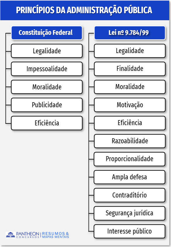 Para facilitar, vamos montar um esquema elencando os princípios da administração pública previstos, tanto no artigo 37, caput, da Constituição Federal, quanto no artigo 2º, da Lei nº 9.784/99: