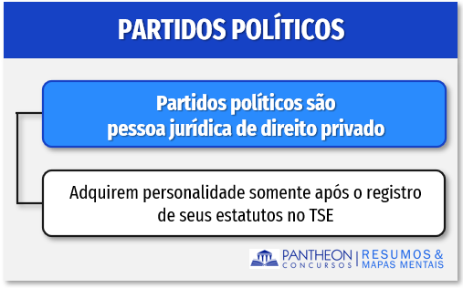 Como vimos, os partidos políticos são pessoa jurídica de direito privado, assim, os partidos políticos adquirem sua personalidade após a inscrição do ato constitutivo no respectivo registro (cartório) (art. 45, CC/02).