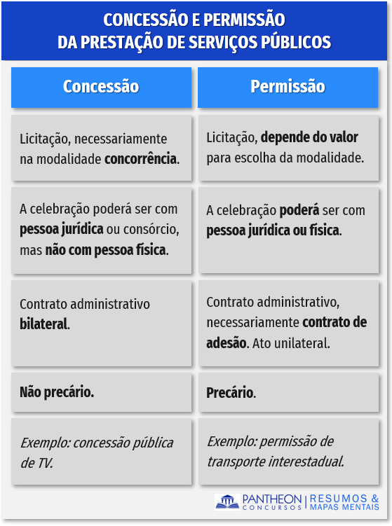 - Permissão de serviço público: a delegação, a título precário, mediante licitação, da prestação de serviços públicos, feita pelo poder concedente à pessoa física ou jurídica que demonstre capacidade para seu desempenho, por sua conta e risco.