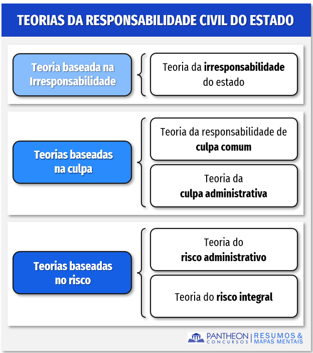 A responsabilidade civil pode ser entendida como a obrigação de se reparar os danos causados mediante indenização. Ao longo do tempo foram diversas as teorias relativas à responsabilidade civil do Estado abaixo vamos esquematizar as teorias que serão analisadas a seguir: Teoria da irresponsabilidade do estado; Teoria da responsabilidade de culpa comum; Teoria da culpa administrativa; Teoria do risco administrativo; e Teoria do risco integral.