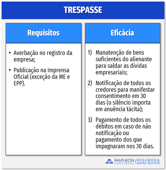 Em relação aos efeitos do trespasse, o Código Civil dispõe que, tanto a alienação, como o usufruto e o arrendamento do estabelecimento empresarial só produzem efeitos após a averbação do contrato à margem da inscrição do empresário no órgão de registro da empresa e for publicado na imprensa oficial – art. 1.144, CC.