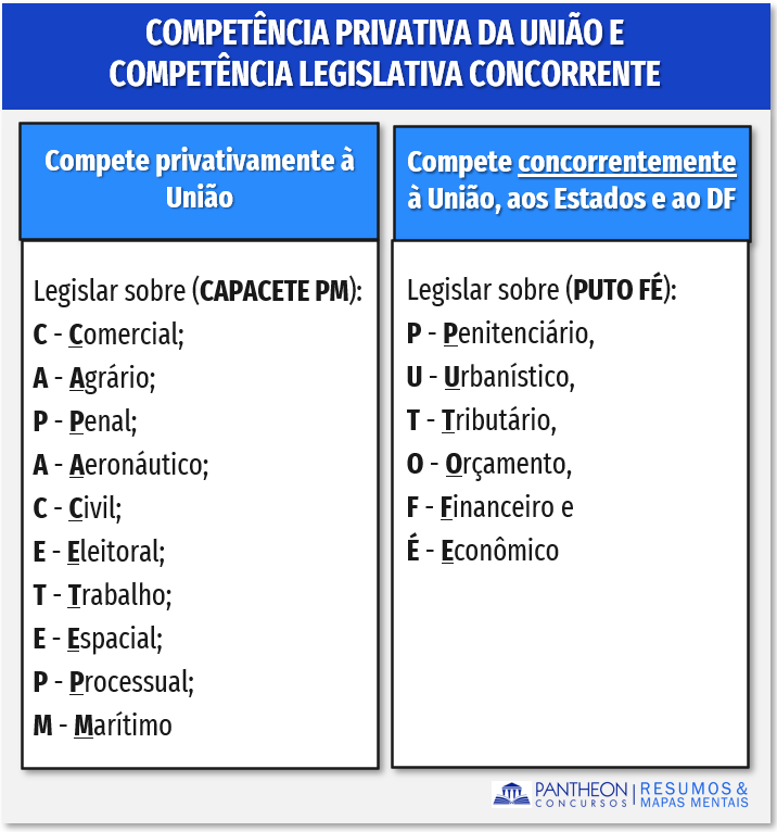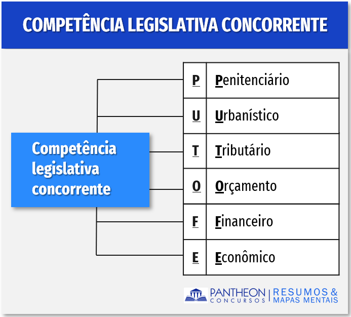 O inciso I, do art. 24, prevê os ramos de direito em que caberá à União estabelecer as normas gerais, fixando as respectivas regras gerais, aos Estados e Distrito Federal (os Municípios não poderão legislar) caberá à competência suplementar e, em caso de ausência de norma geral da União, aqueles entes terão competência plena, seguem as matérias elencadas no art. 24, I e II, da CF: Penitenciário, Urbanístico, Tributário, Orçamento, Financeiro e Econômico. Já o mnemônico é o PUTO FÉ.