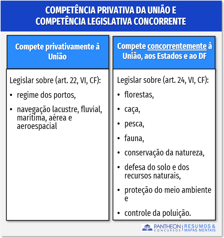Outra relação importante que já foi objeto de cobrança, a competência de legislar sobre florestas, caça, pesca, fauna, conservação da natureza, defesa do solo e dos recursos naturais, proteção do meio ambiente e controle da poluição é concorrentemente entre União, Estados e DF (art. 24, VI, CF). Já a competência de legislar sobre o regime dos portos, navegação lacustre, fluvial, marítima, aérea e aeroespacial é privativa da União (art. 24, VI, CF).