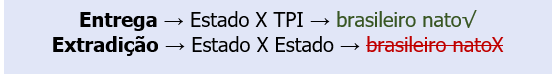 Desse modo, o brasileiro nato nunca será extraditado, a menos que ele perca sua nacionalidade brasileira antes dos fatos que motivarem seu pedido de extradição. Apenas o brasileiro naturalizado poderá ser extraditado e somente em duas situações: