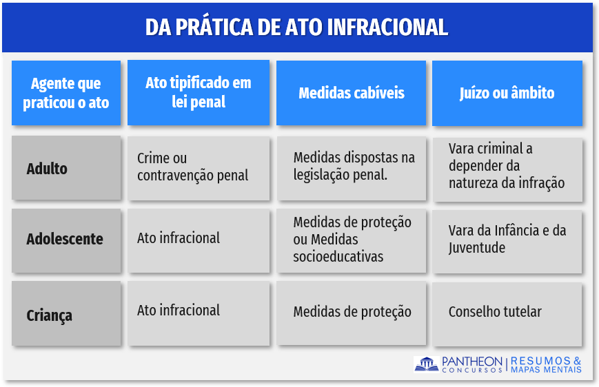 Se o ato infracional for praticado por adolescente – pessoa entre os 12 anos completos até os 18 anos incompletos – esse ato será passível de medidas de proteção ou medidas socioeducativas, sendo que o ato será analisado pela Vara da Infância e da Juventude. Se o ato infracional for praticado por criança – pessoa menor de 12 anos – essa receberá uma medida socioeducativa apenas, e aquele ato será analisado pelo Conselho Tutelar.