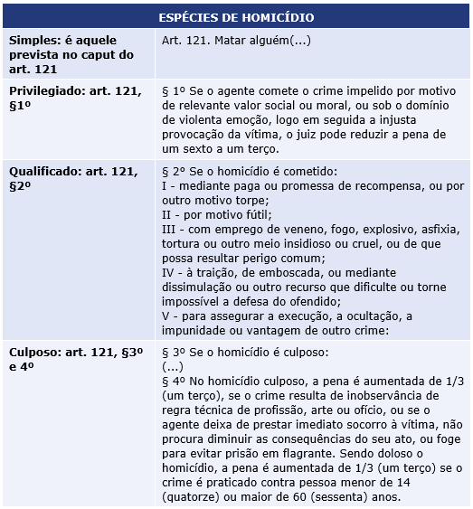 Quanto às espécies de homicídio, podemos assim resumir (Guardem no coração de vocês esse quadro-resumo! Ele salva vidas na hora da prova! 😊)