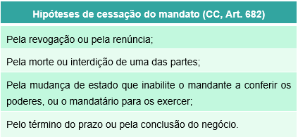 Por fim, são válidos, a respeito dos contratantes de boa-fé, os atos com estes ajustados em nome do mandante pelo mandatário, enquanto este ignorar a morte daquele ou a extinção do mandato, por qualquer outra causa. (CC, Art. 689).