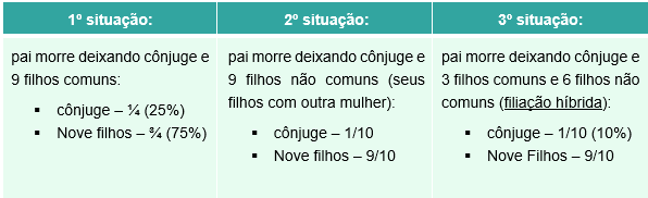 Enunciado n. 527 CJF/STF: “Na concorrência entre o cônjuge e os herdeiros do de cujus, não será reservada a quarta parte da herança para o sobrevivente no caso de filiação híbrida.”