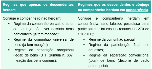 Enunciado 270 do CJF/STF: “O art. 1.829, inc. I, só assegura ao cônjuge sobrevivente o direito de concorrência com os descendentes do autor da herança quando casados no regime da separação convencional de bens ou, se casados nos regimes da comunhão parcial ou participação final nos aqüestos, o falecido possuísse bens particulares, hipóteses em que a concorrência se restringe a tais bens, devendo os bens comuns (meação) ser partilhados exclusivamente entre os descendentes”.