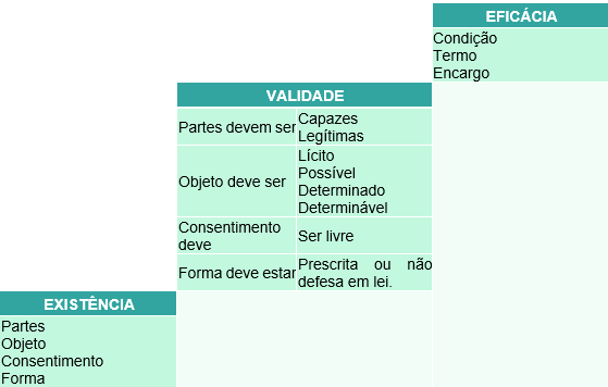 c) Plano da Eficácia – são os elementos acidentais do negócio jurídico que, se presentes, produzem efeitos em relação à eficácia do negócio jurídico (condição, termo e encargo
