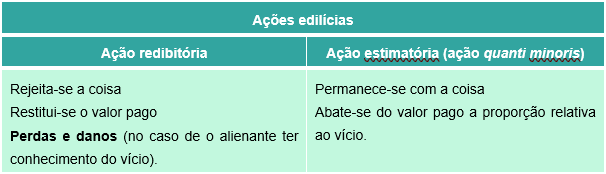 Ação redibitória: no caso de o adquirente optar pela rejeição da coisa, restituição do valor pago e, no caso de o alienante ter o conhecimento do vício, poderá o adquirente requerer perdas e danos.